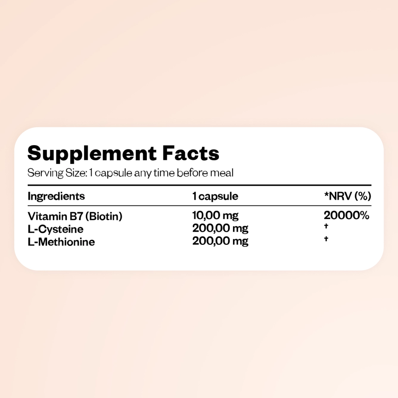 Składniki: L-cysteina, L-metionina, biotyna, kapsułka (substancja glazurująca, hydroksypropylometyloceluloza, barwnik – czerwony tlenek żelaza), celuloza mikrokrystaliczna.