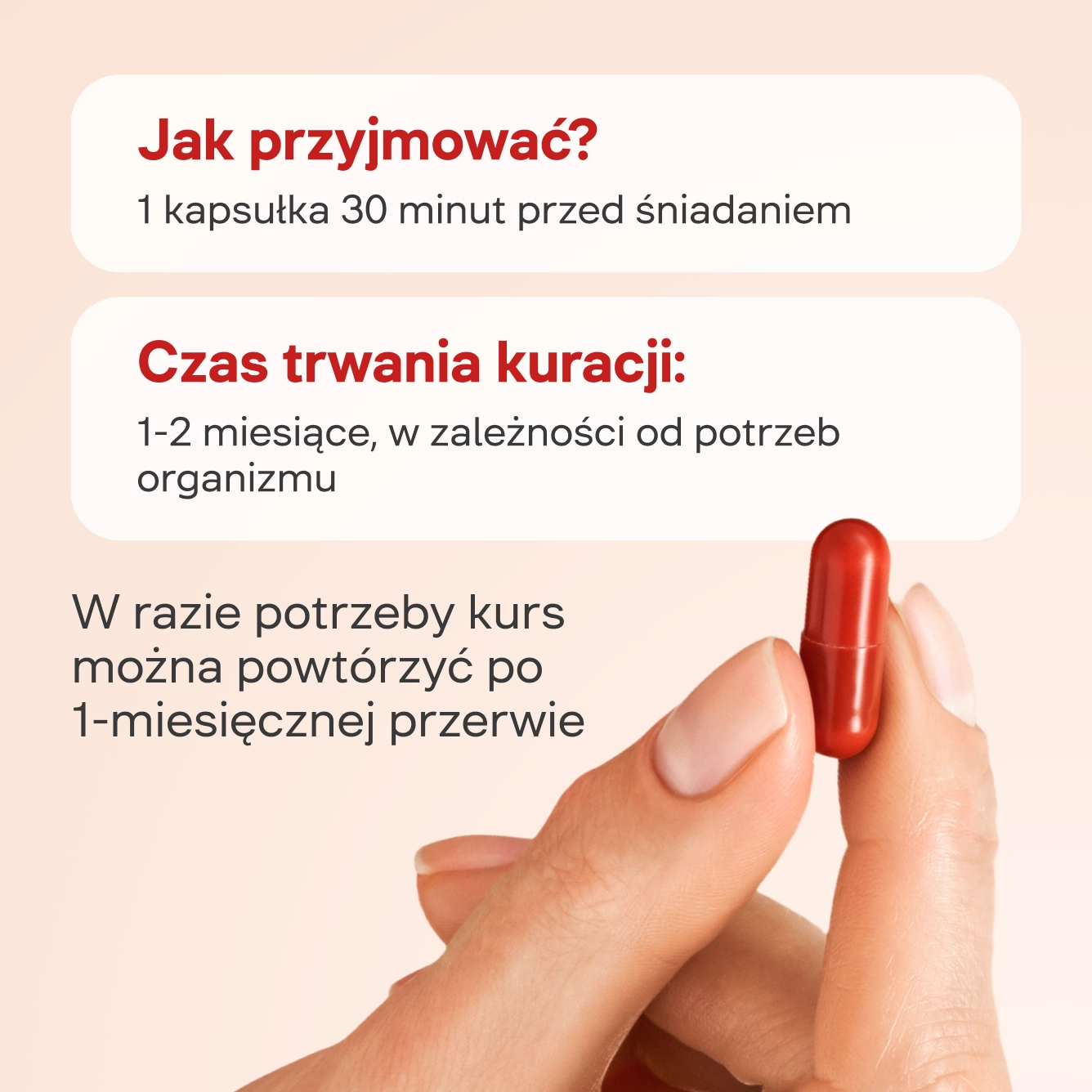 Zażywaj po jednej kapsułce rano. Dla najlepszego wchłaniania – 30 minut przed posiłkiem.