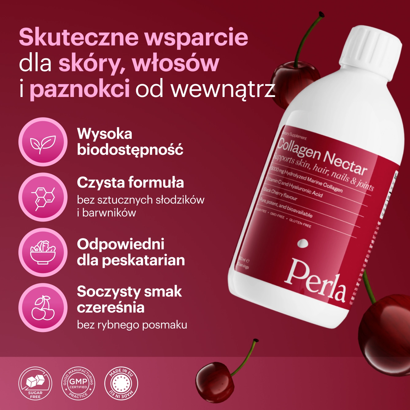 Płynny kolagen morski o o smaku soczystej czereśni dla promiennej skóry, mocnych paznokci i włosów. Zawiera potrójną moc kolagenu morskiego, kwasu hialuronowego i witaminy C. A do tego jest bardzo smaczny!
