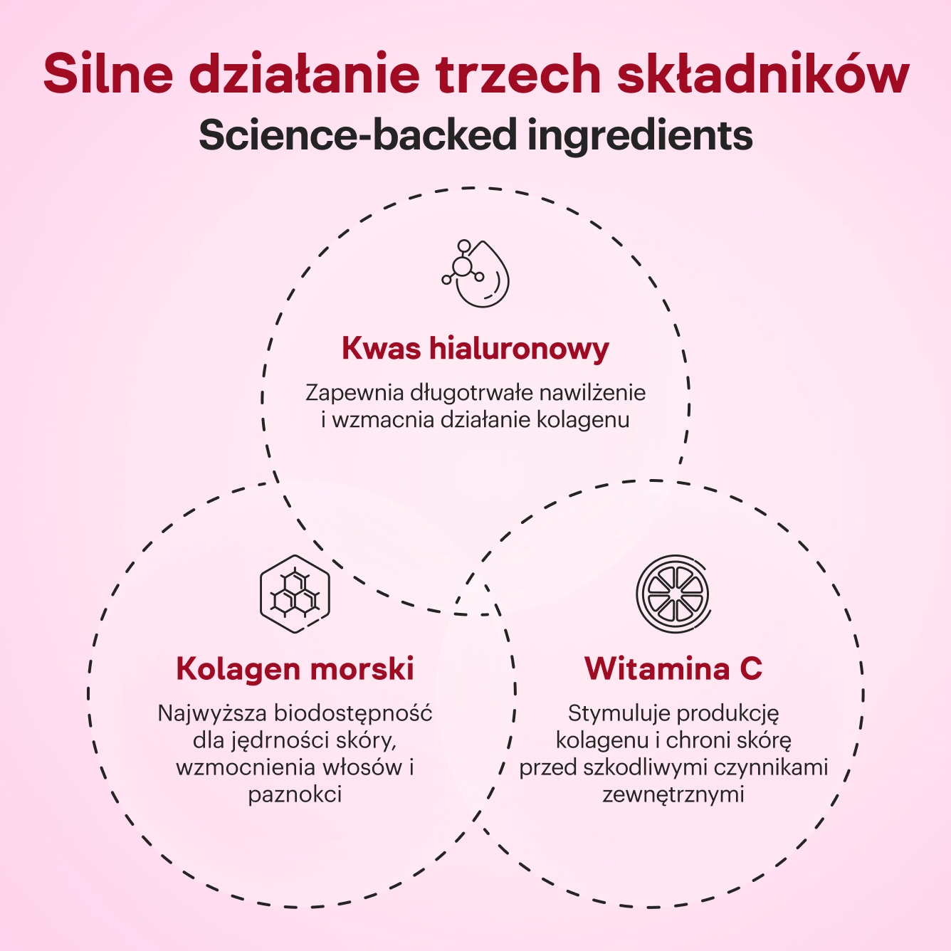 Połączyliśmy trzy potężne składniki – morski kolagen, kwas hialuronowy i witaminę C. Dzięki temu na pewno zauważysz efekty suplementacji!