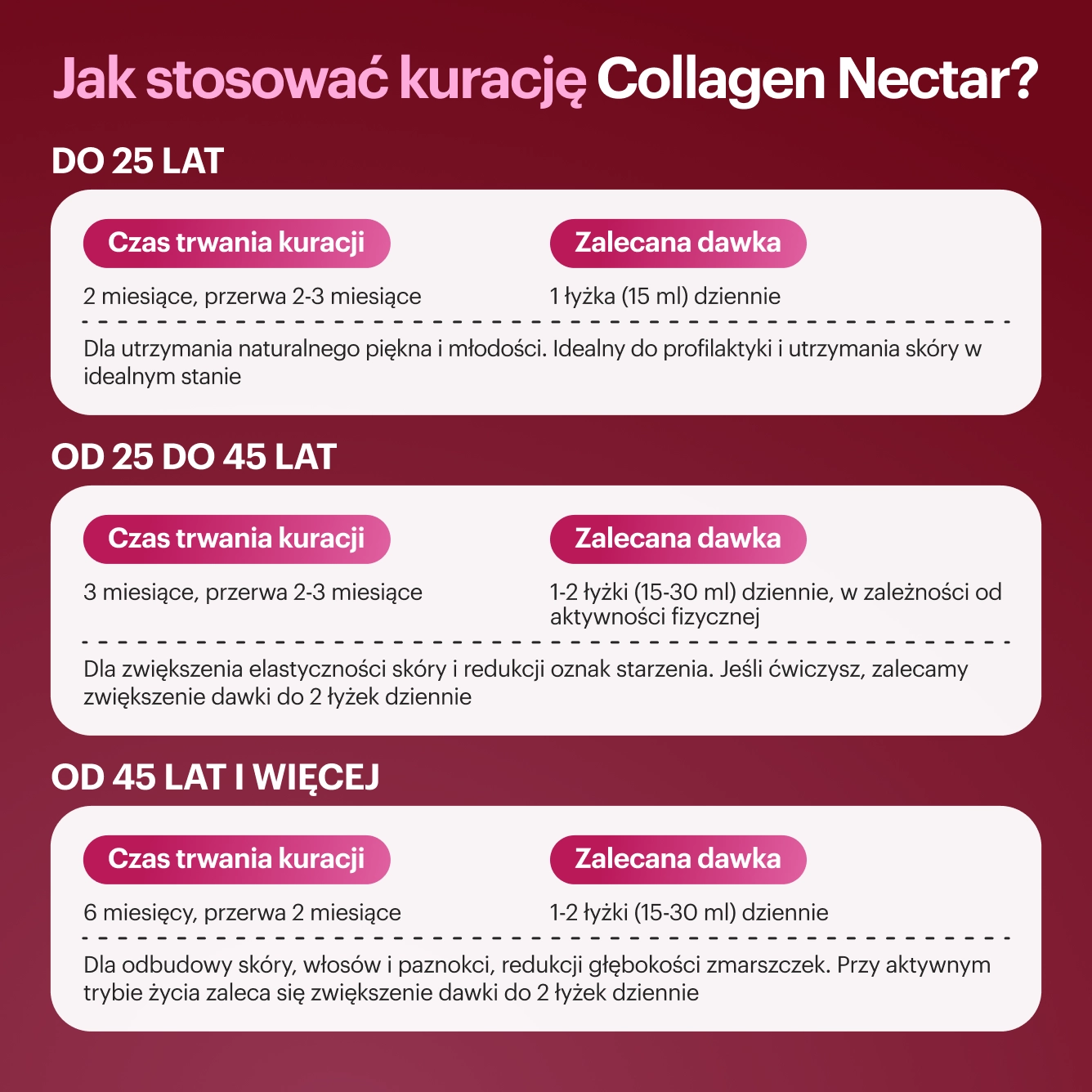 6 miesięcy, a następnie 2 miesiące przerwy. Po 45. roku życia – w celu zachowania naturalnej młodości skóry i redukcji widocznych zmarszczek oraz drobnych linii.