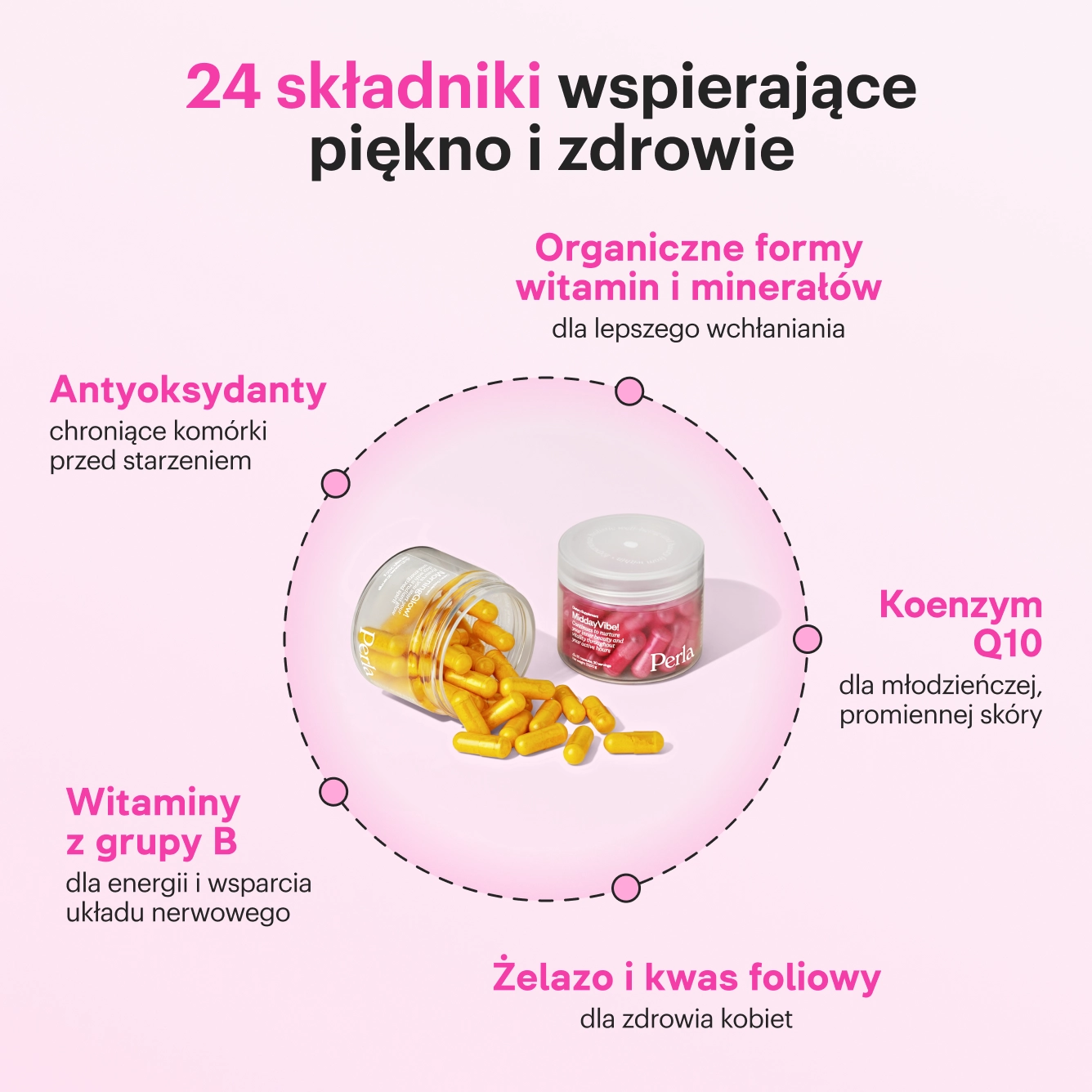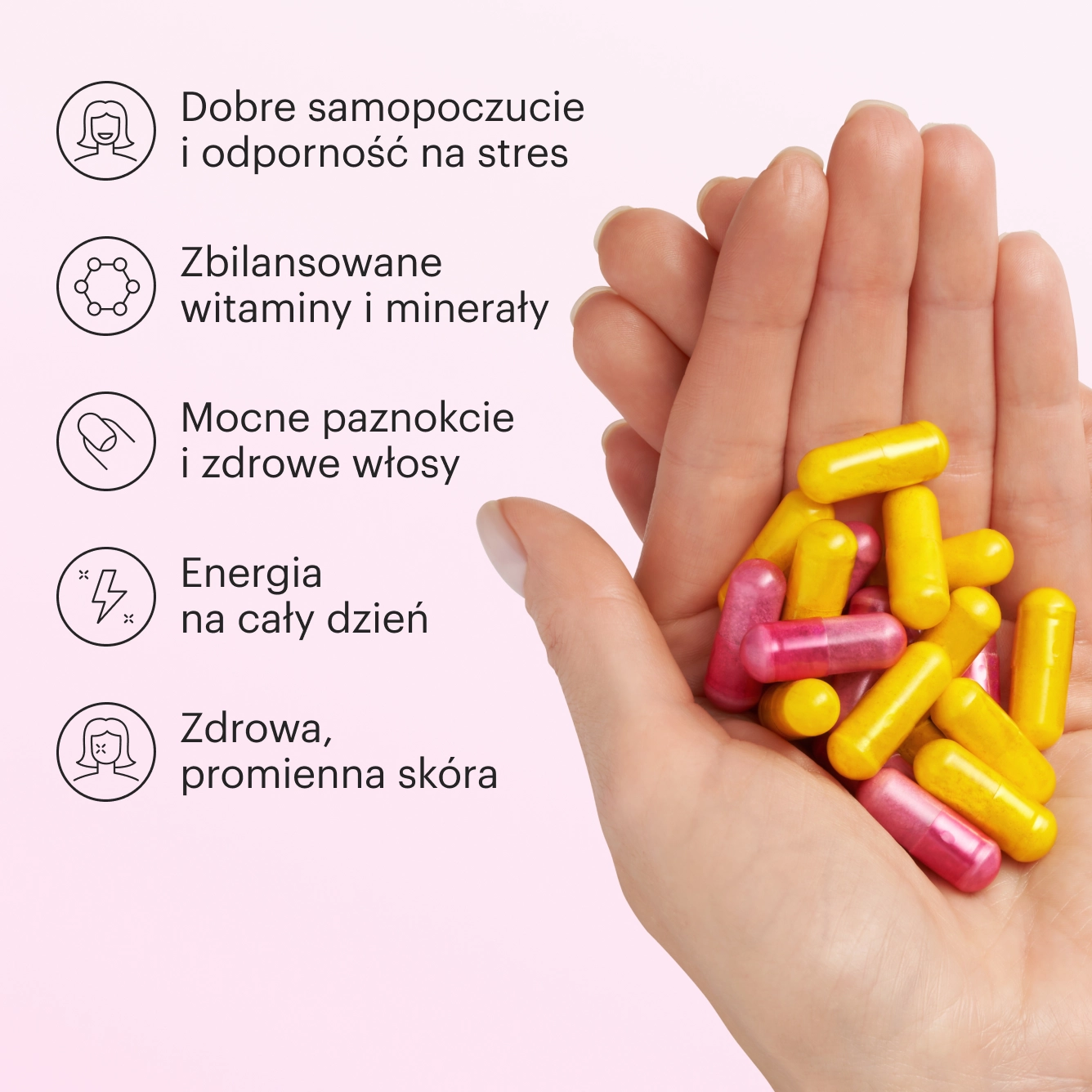 24 składniki dla piękna i zdrowia w dwóch kapsułkach: żółta — na rano, różowa — na dzień. Biotyna, żelazo, kwas foliowy, magnez, selen, koenzym Q10 oraz inne — fundament dla organizmu kobiety.