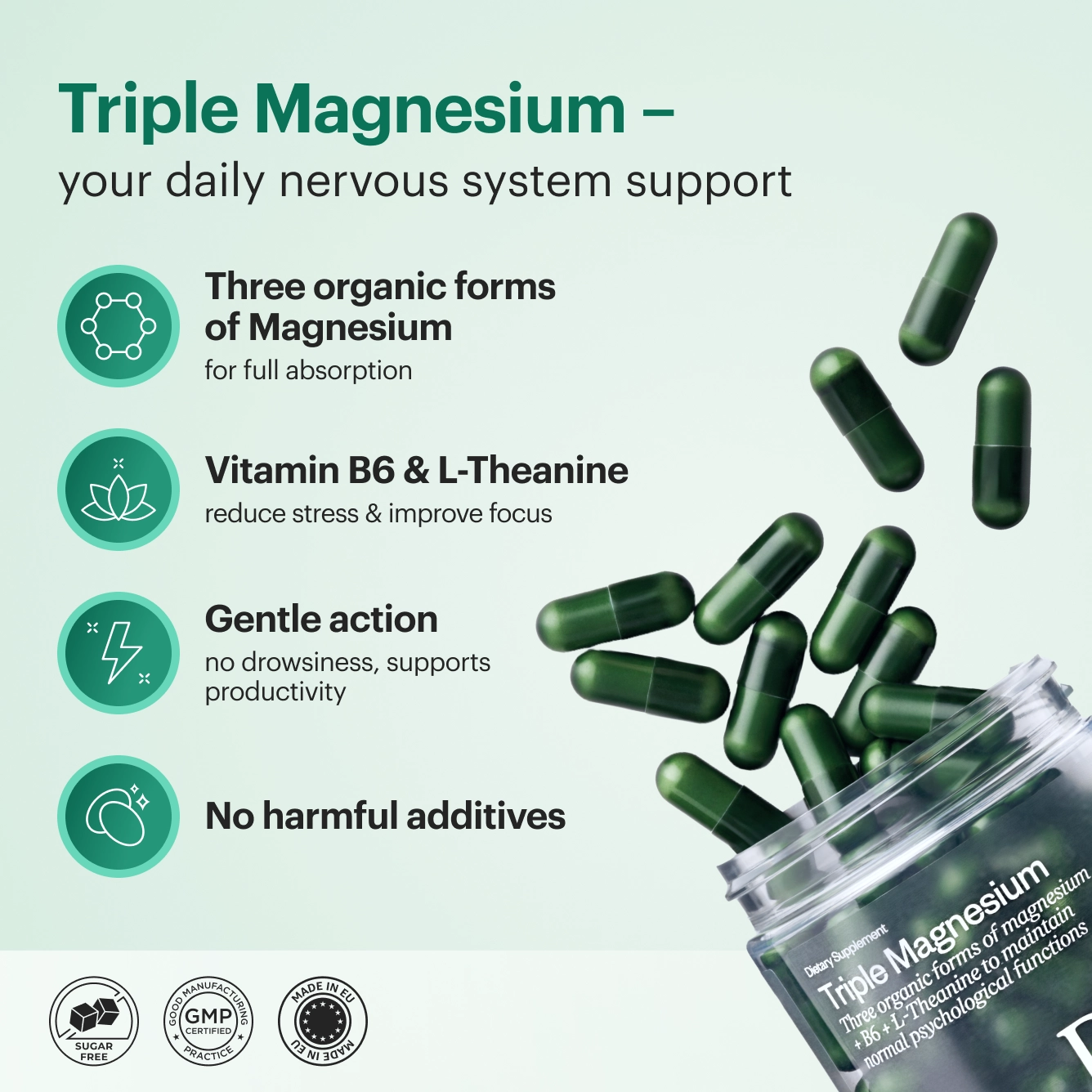 Constantly under stress? Triple Magnesium helps you relax. Three organic forms of magnesium and Vitamin B6 support better sleep, mood, and nervous system health.