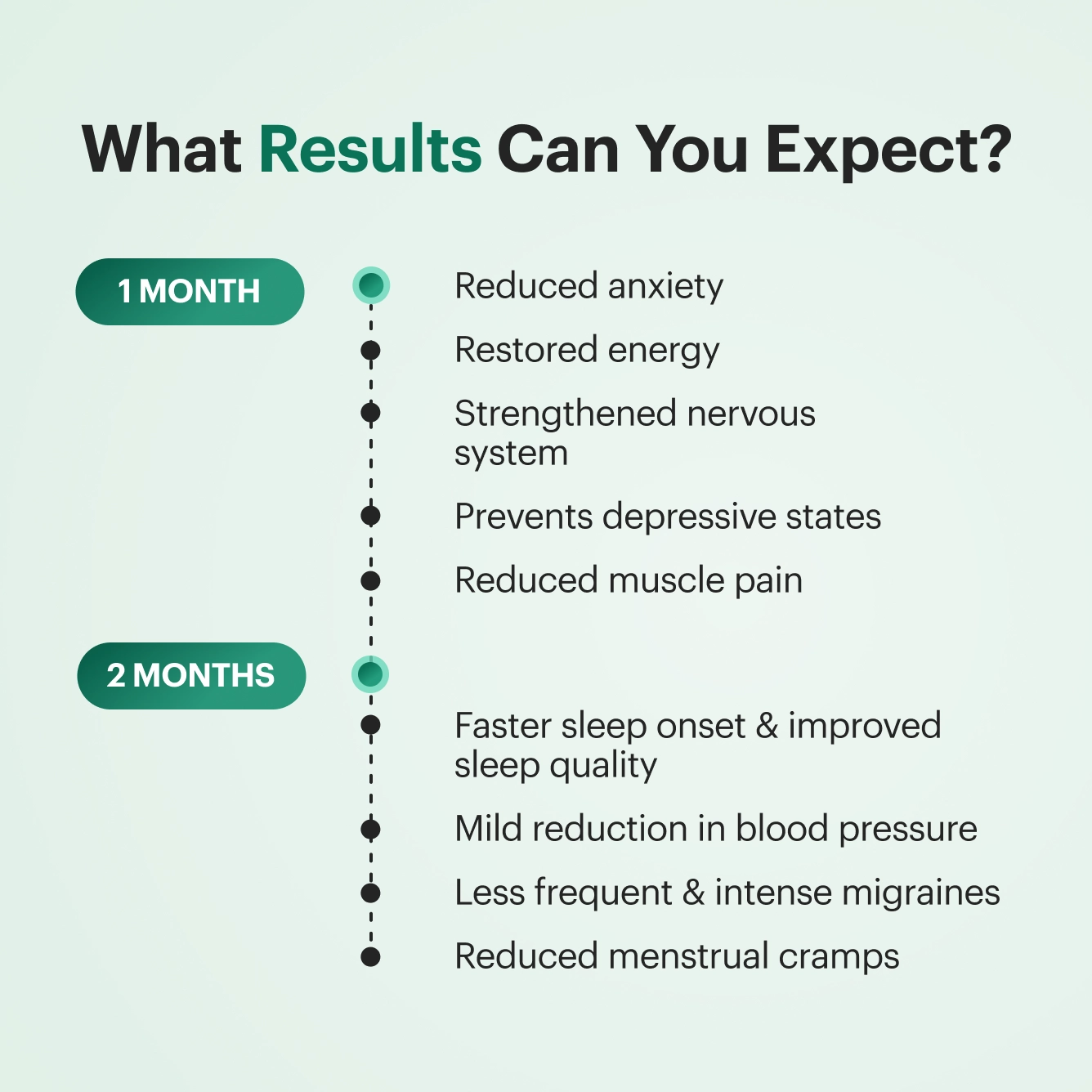We recommend taking the supplement for 1-2 months for a tangible effect. If necessary, repeat the course after a 1-2 month break. Also take it as needed – if you feel stressed and need to calm down right now.